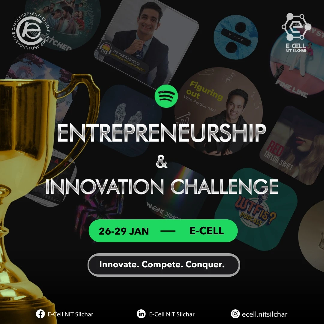 The Entrepreneurship & Innovation Challenge is NIT Silchar's flagship entrepreneurship event, organized by E-Cell. Like your favorite playlist that keeps you motivated, EIC brings together the best minds to innovate, compete, and conquer.
